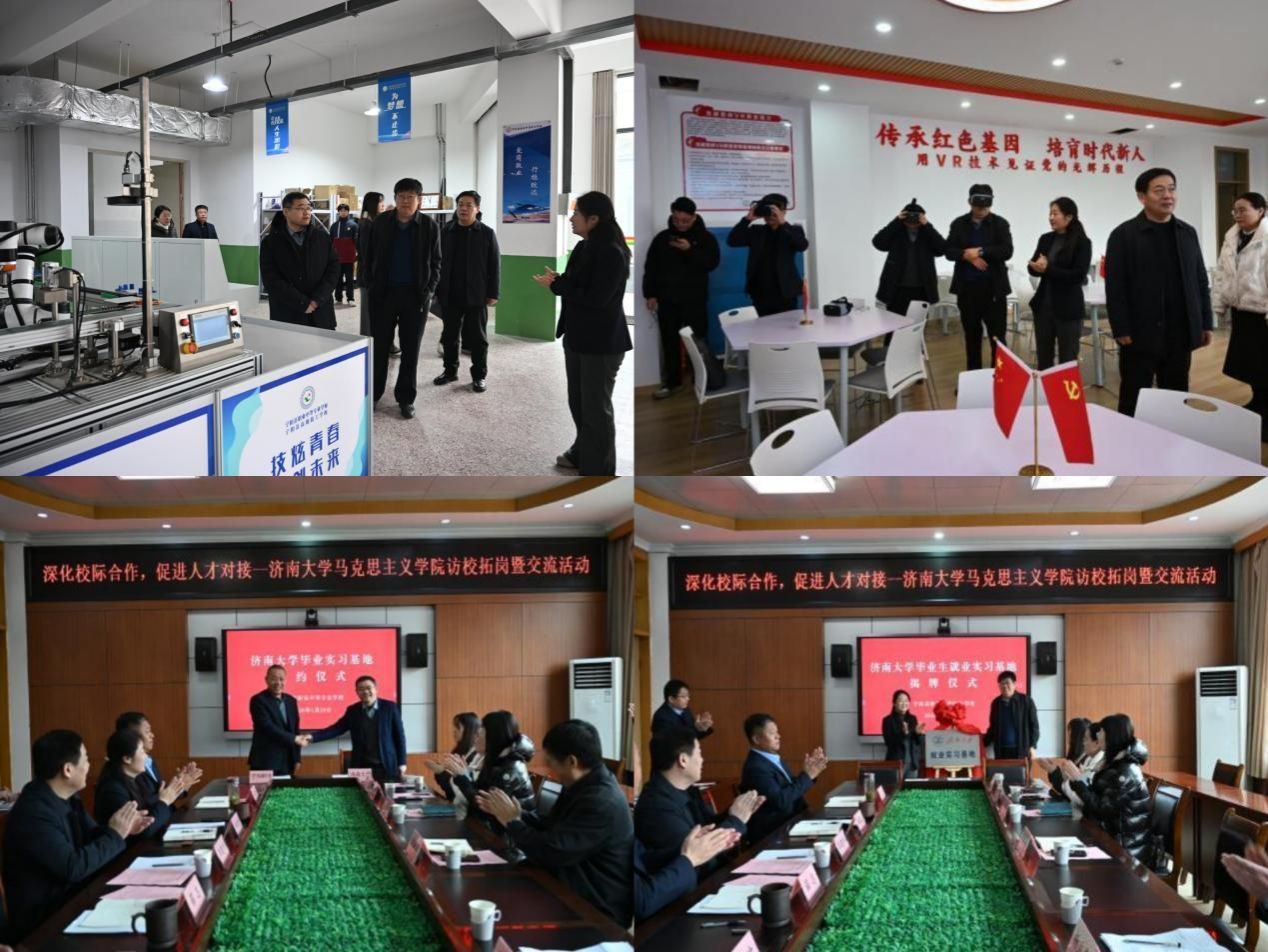 在宁阳职业中专,学院代表团实地考察了校园建设,并详细了解学校在办学定位、专业发展及学生思想政治教育方面的实践与挑战。双方围绕大中小学思政课一体化建设、师资能力提升、课程资源共享等议题展开深入交流。杨立志院长表示,马克思主义学院愿发挥高校资源优势,在思政课程建设、教师培训、实践教学等方面提供支持,共同构建协同育人机制。活动中,双方签订了合作协议,并为“济南大学就业实习基地”揭牌,标志着校校合作进入实质推进阶段。