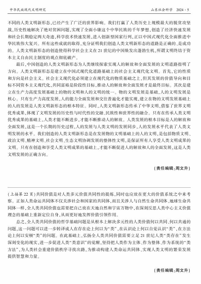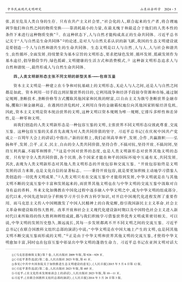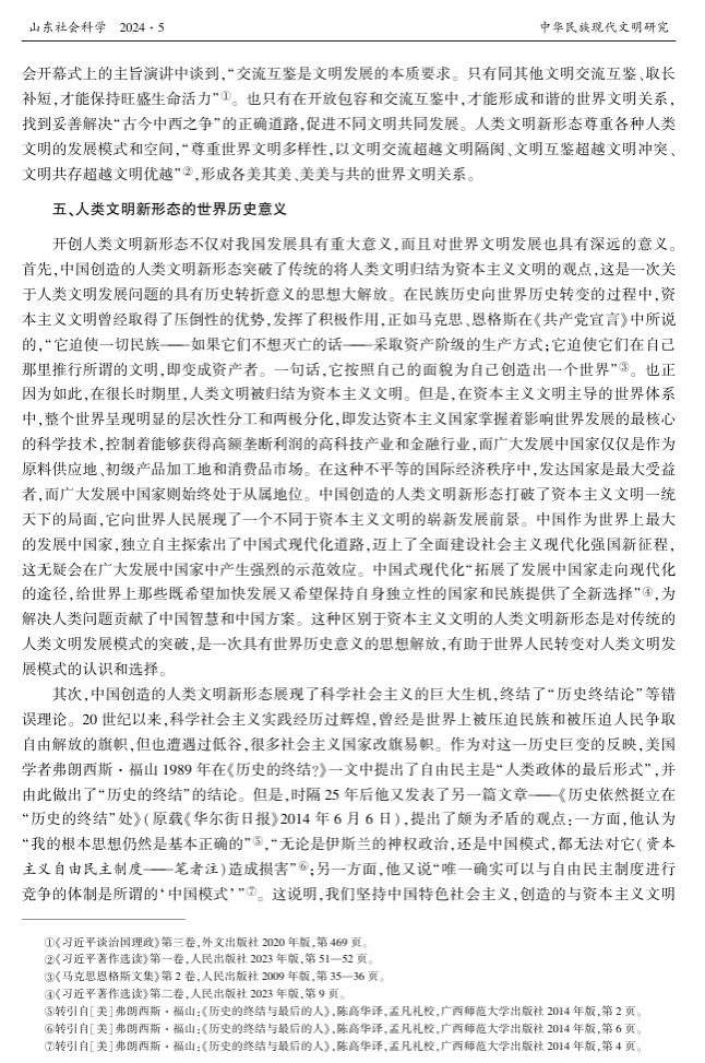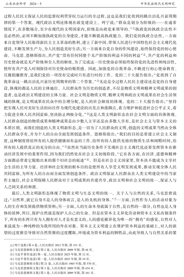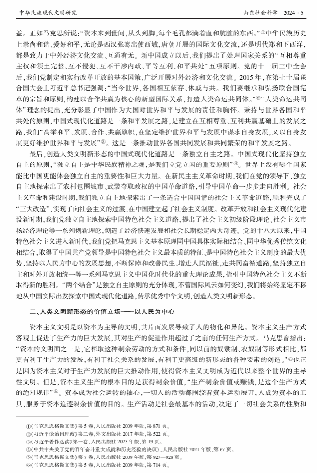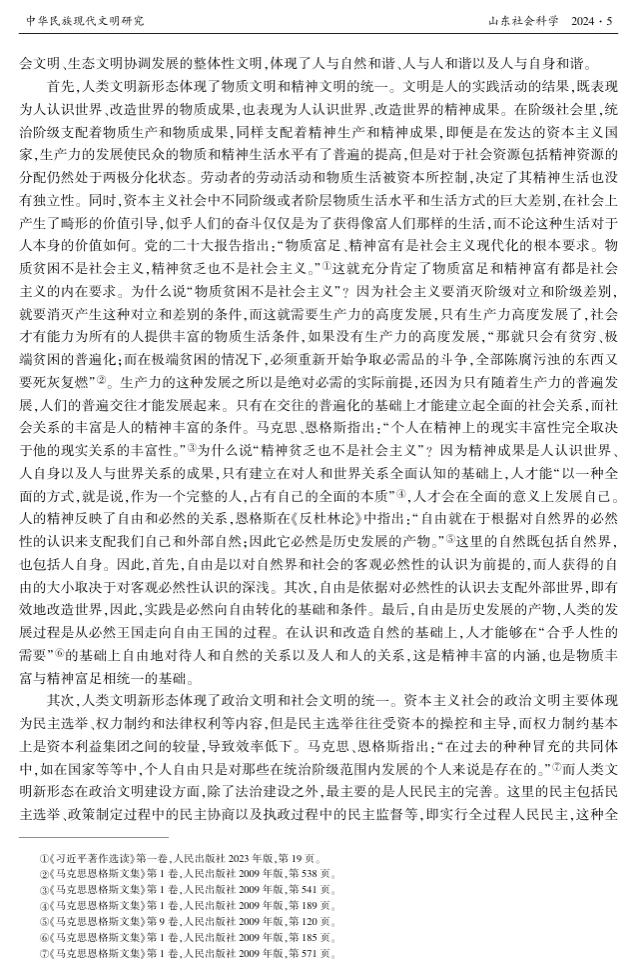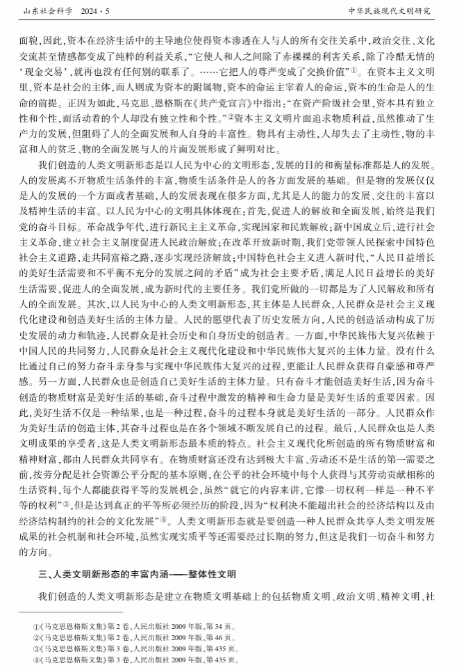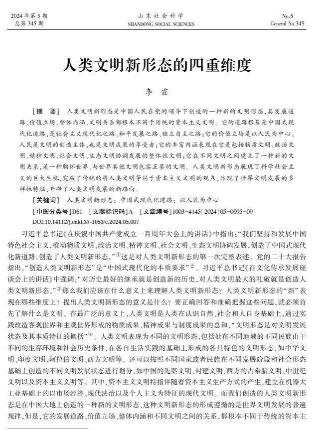 我院教师论文在《山东社会科学》发表文章 我院李霞教授的学术论文《人类文明新形态的四重维度》在《山东社会科学》(2024年第5期)发表,并被《中国社会科学文摘》(2024年第9期)观点摘登。 论文指出:人类文明新形态是中华民族在党的领导下创造的一种新的文明形态,其发展道路、价值立场、整体内涵、文明关系都不同于资本主义文明。其道路根基是中国式现代化道路,是社会主义现代化之路、和平发展之路、独立自主之路;其价值立场是以人民为中心,人民是文明的创造主体,也是文明成果的享受者;其丰富内涵表现在它是包括物质文明、政治文明、精神文明、社会文明、生态文明协调发展的整体性文明;它在不同文明之间建立了一种新型的文明关系,是一种胸怀世界、与世界其他文明包容互鉴的文明。人类文明新形态展现了科学社会主义的巨大生机,突破了将人类文明等同于资本主义文明的传统观点,体现了世界文明发展的多样性特征,开辟了人类文明发展的新路向。
